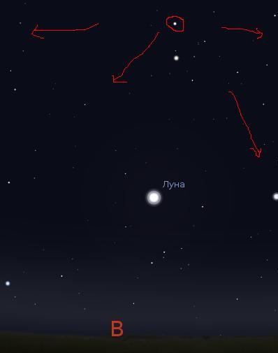 Метеоры как бы вылетают из Кастора в разные стороны. Кастор сейчас (около полуночи) на востоке, почти прямо над Луной. Луна – 18 градусов над горизонтом, Кастор – 41 градус над горизонтом. (Две звезды одна над другой. Нижняя Поллукс, верхняя Кастор).