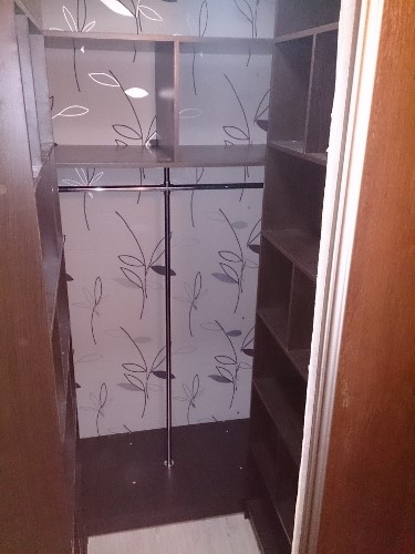 из интересных новинок. Абсолютно одинаковая планировка, двухкомнатная лененградка, ниша в коридоре. В первом случае захотели книжную полку. Очень понравилось. Во втором захотели именно такой шкаф. Особенности этого шкафа, выполнен он не в виде, как принято прямоугольника, а в виде шестиугольной трапеции. К сожалению на фото плохо видно. И вторая особенность, это дверка. Выполнена из алюминиево профиля типа "версаль", но она не сдвижная, а распашная. Заказчики довольны.