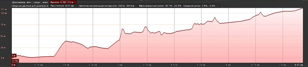 andy, Андрей, в итоге получилась такая картинка... 8,07 км протяженность маршрута в одну сторону, с перепадом высот в 100 метров