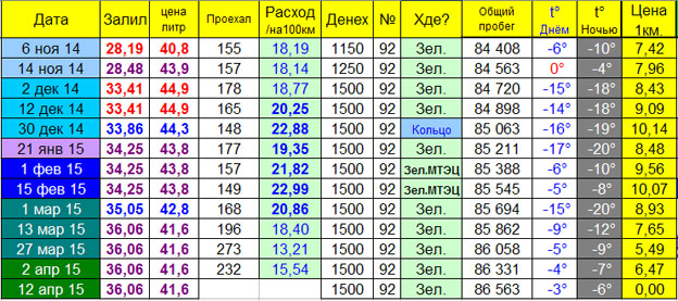 Зима: январь этого года, перед любым запуском пользуюсь электро подогревом, среднее время работы двигателя перед движением - 12 минут, комплект зимней шипованной резины, средний режим работы печки: 2-ое положение, пройденное расстояние - 1400 км., город - 60%, трасса - 40%: