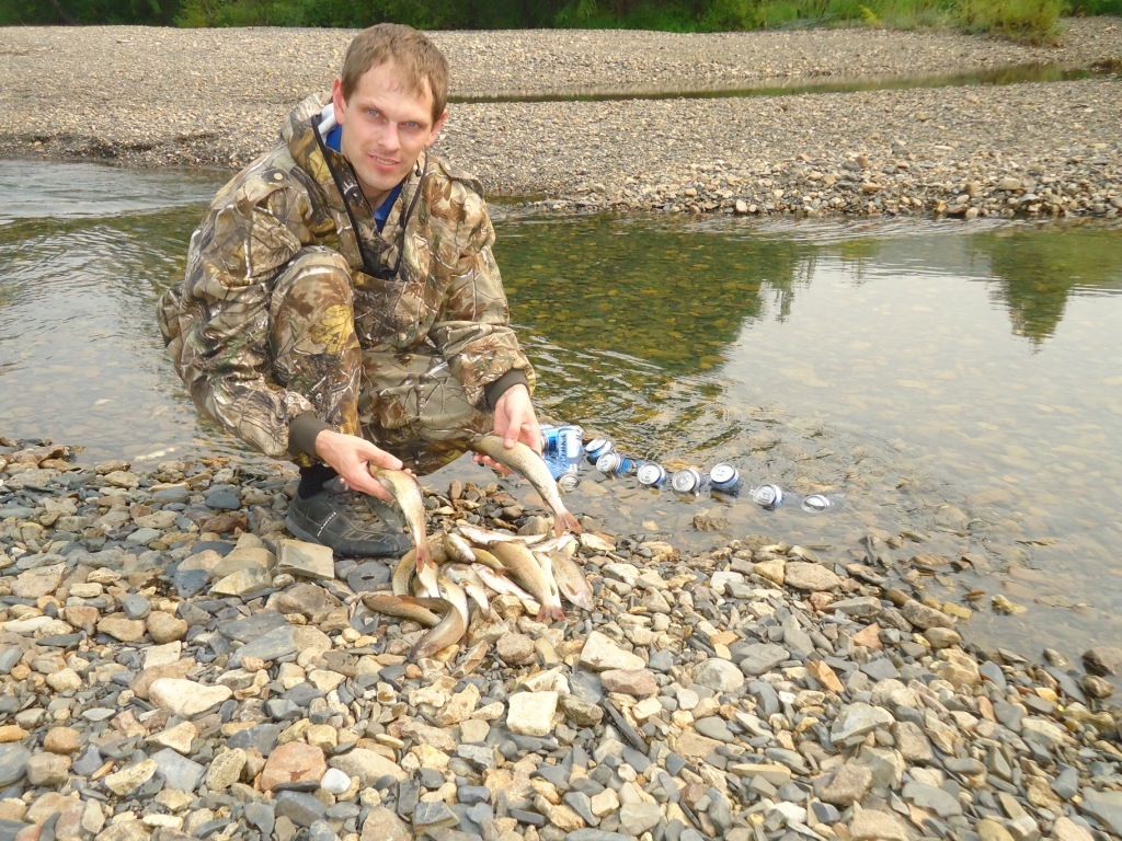 Идем к стоянке. Дальнейшие планы – проехать на машине как можно выше по Хурчану (дорога заросшая есть). К нашей радости, там рыба есть. Обкидываем несколько сбоек-ям и вытаскиваем опять белячков. Крупного нет.
