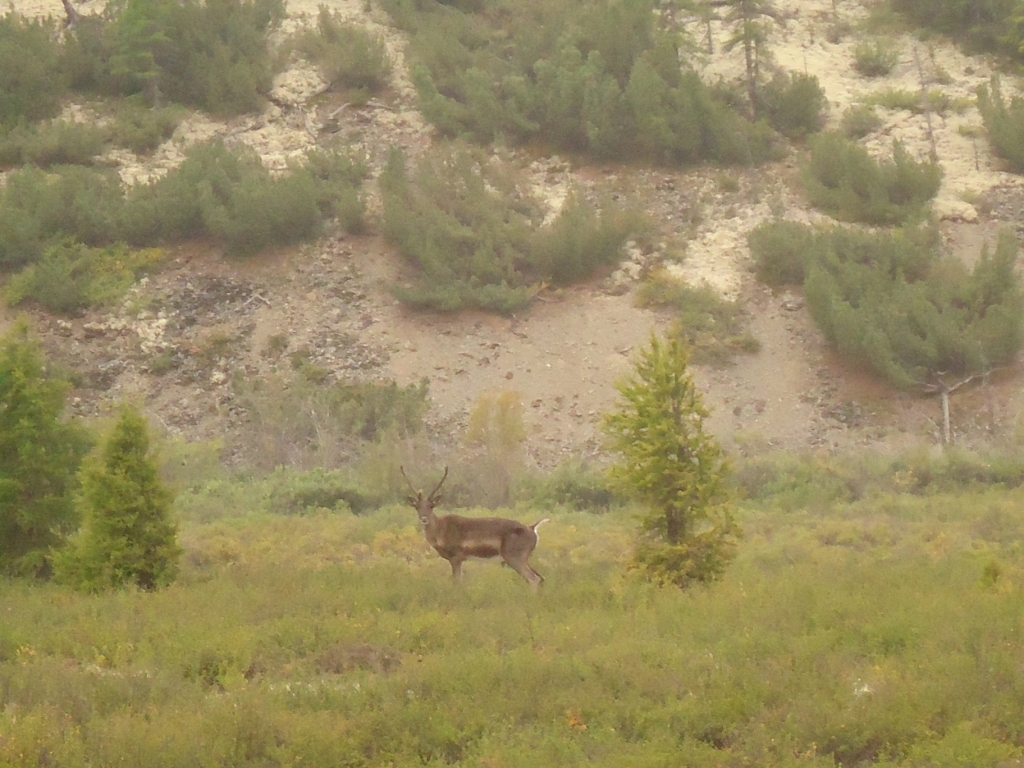 Перед выездом на основную трассу, в 30 м от дороги замечаю оленя. Он не спешит убегать. Отбежав буквально 50 м, остановился и смотрел в течение минуты.
